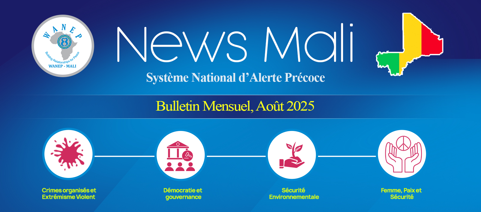 La situation sécuritaire au Mali reste marquée par des dynamiques complexes mêlant violences armées, tensions sociopolitiques et vulnérabilités environnementales Dans ce contexte, le Système National d’Alerte Précoce et de Réponse (NEWS-Mali) de WANEP-Mali, poursuit son engagement à documenter et analyser les incidents affectant la sécurité humaine à travers le pays. Le présent bulletin, couvrant le mois d’août 2025, s’inscrit dans cette dynamique de veille citoyenne et institutionnelle.