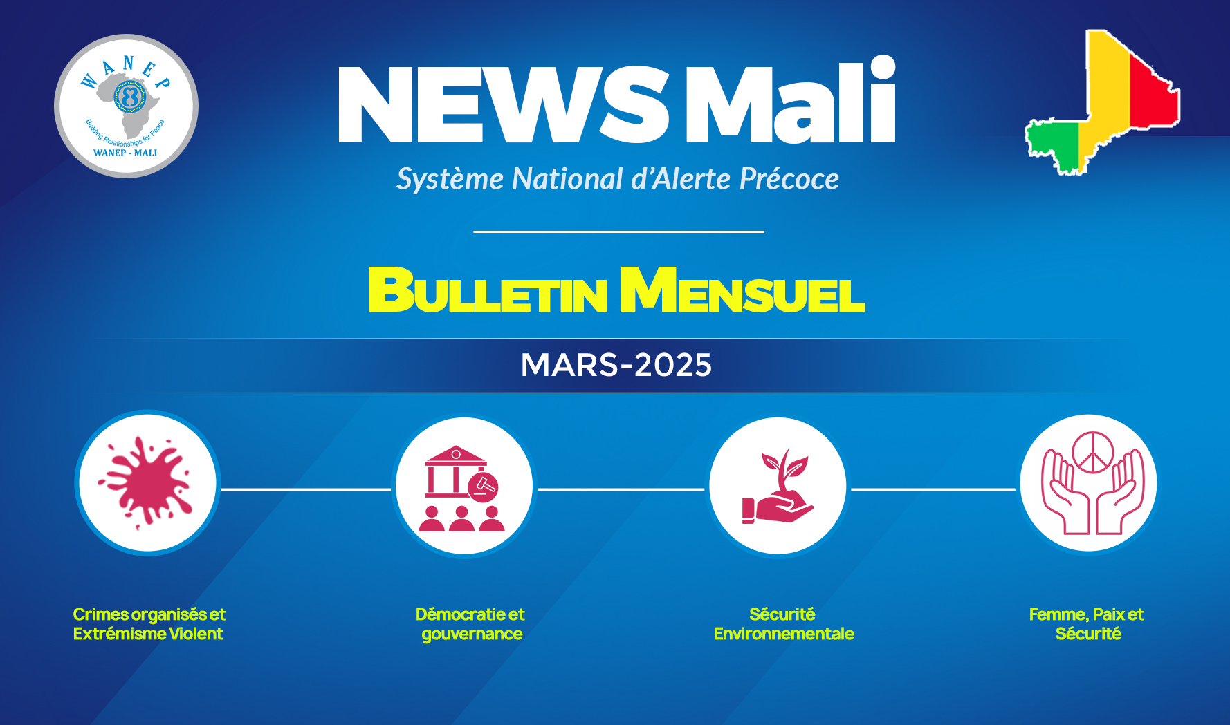 Ces incidents rapportés concernent les domaines thématiques suivants: Crime organisés et Extrémisme violent; Femme, Paix et Démocratie et Gouvernance; et Sécurité Environnementale.